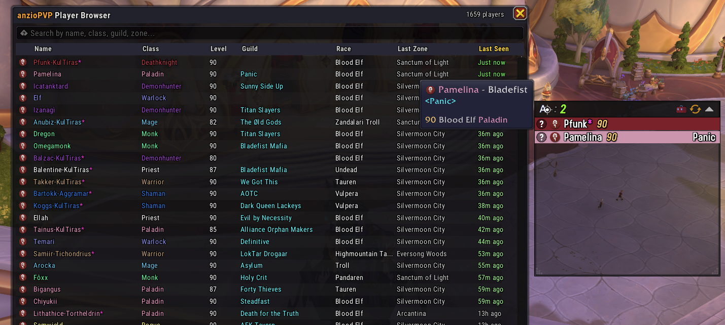 Introducing the Player Browser and stats tracker. AnzioPVP was updated for Midnight and has almost all functionality returned with the exception of: worse stealth detection (no combat log tracking), proximity based alerts in instanced PVP (addon still functions in all battlegrounds and arenas, but relies on proximity checks rather than the combat log). For the most part, you will not notice any difference.